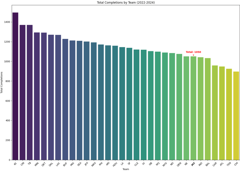 Completions obviously aren’t a direct indicator to passing success, but you still see the Steelers again near the bottom here. We know they throw the ball at a low rate compared to the rest of the league so this isn’t super surprising, but even when they do they still fail. Maybe don’t just chuck five go balls 40 yards down the field every game? They have to better at taking what the defense gives them, finding soft spots in the zone, and attacking the defenses weaknesses.