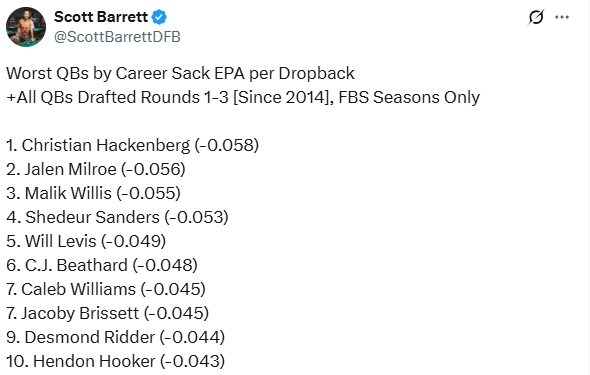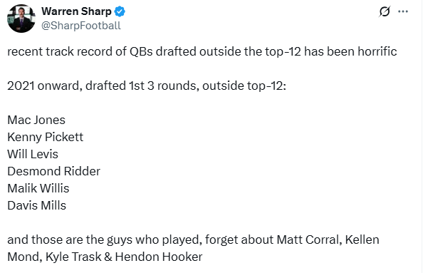 I will immediately begin by saying this is the player I want to see the ABSOLUTE LEAST at 21. And there are a lot of reasons why. I’m not going to come out and say I watch every single college football game like I do the NFL, but I watch a decent amount of college football and with Colorado being prime time TV (no pun intended) in recent years I’ve watched a lot of Shedeur Sanders games. There was not one time watching him where I thought “woah what a play” or “wow what a throw.” The only wow-factor in their games was Travis Hunter making Sanders look much better than he actually is. He has average arm strength (maybe even below average on deep balls), holds the ball too long, and is stunningly unathletic. He was able to get away with running around in the pocket to extend plays in the Big 12, but he’s not quick or fast enough to get away with it in the league.